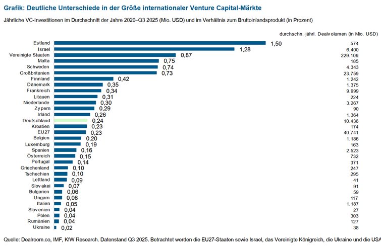 Der Schein trügt. Der deutsche Venture Capital (VC)-Markt gehört zwar zu den Volumenstärksten weltweit. Zwischen 2020 und dem dritten Quartal 2025 wurden jährlich im Durchschnitt 10,4 Mrd. USD in Start-ups investiert. In Europa wurde dieser Wert nur im Vereinigten Königreich übertroffen (23,8 Mrd. USD). Setzt man die Investitionen jedoch ins Verhältnis zur Wirtschaftskraft des Landes (Bruttoinlandsprodukt, BIP) rangiert der deutsche VC-Markt mit 0,24 % nur knapp über dem Durchschnitt der EU27-Länder (0,23 %).