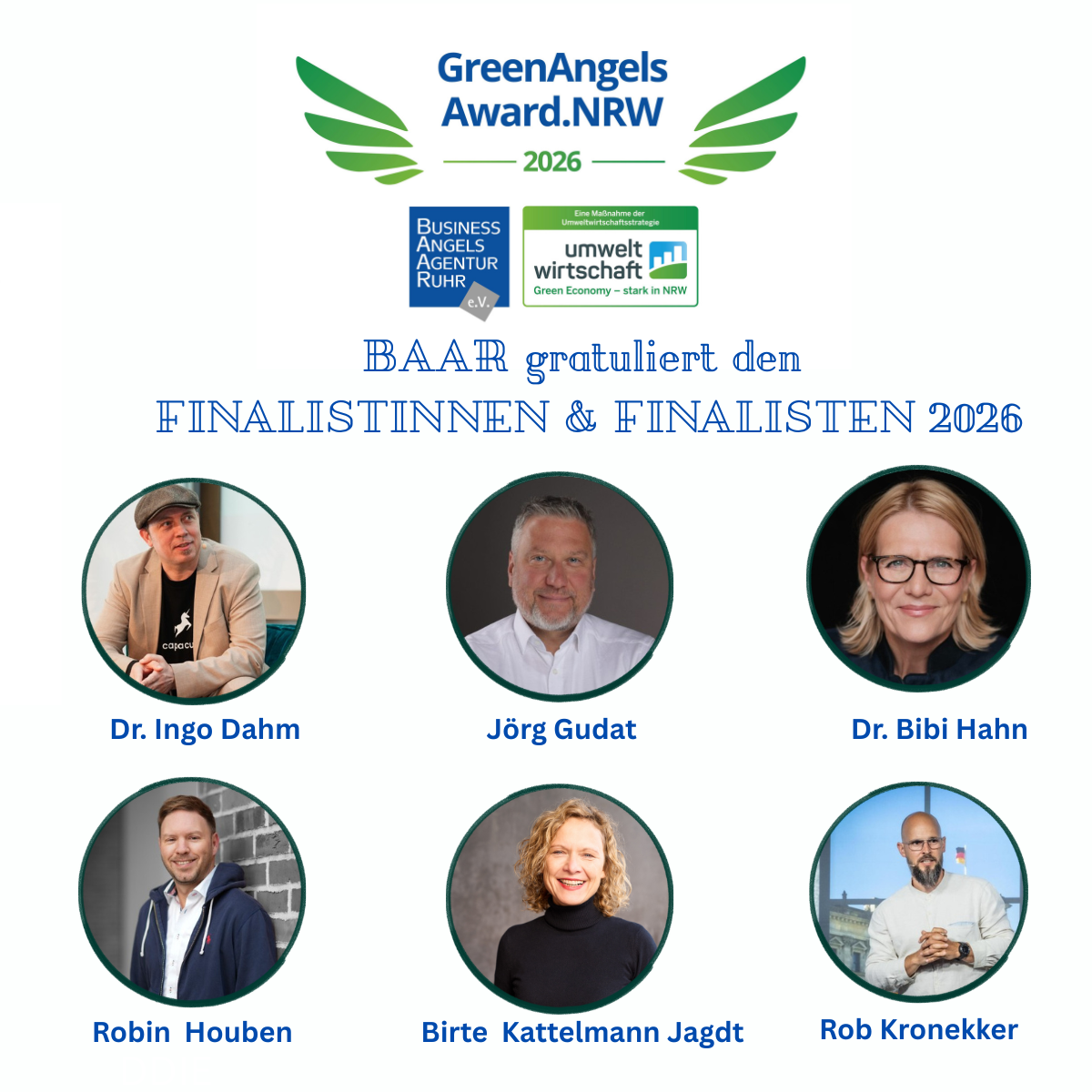 Wer wird die oder der Erste sein, der mit dem „GreenAngelsAward.NRW“ ausgezeichnet wird? Das spannende Rennen ist eröffnet. Diese sechs Finalistinnen und Finalisten stehen fest: Dr. Ingo Dahm, Köln; Jörg Gudat, Bochum; Dr. Bibi Hahn; Berlin; Robin Houben, München; Robert Kronekker, Düsseldorf; Birte Kattelmann-Jagdt, Düsseldorf. Die Jury unter Vorsitz von Viktor Haase, Staatssekretär im NRW-Umweltministerium, hat eine schwierige Entscheidung zu treffen, denn bereits jetzt steht fest: Alle sechs Angels tragen mit ihren grünen Angel Investments dazu bei, dass die Welt und unser Land zukunftsfähiger werden. Keine Frage, es braucht mehr denn je mutige Angels, die die ökologische Transformation vorantreiben.